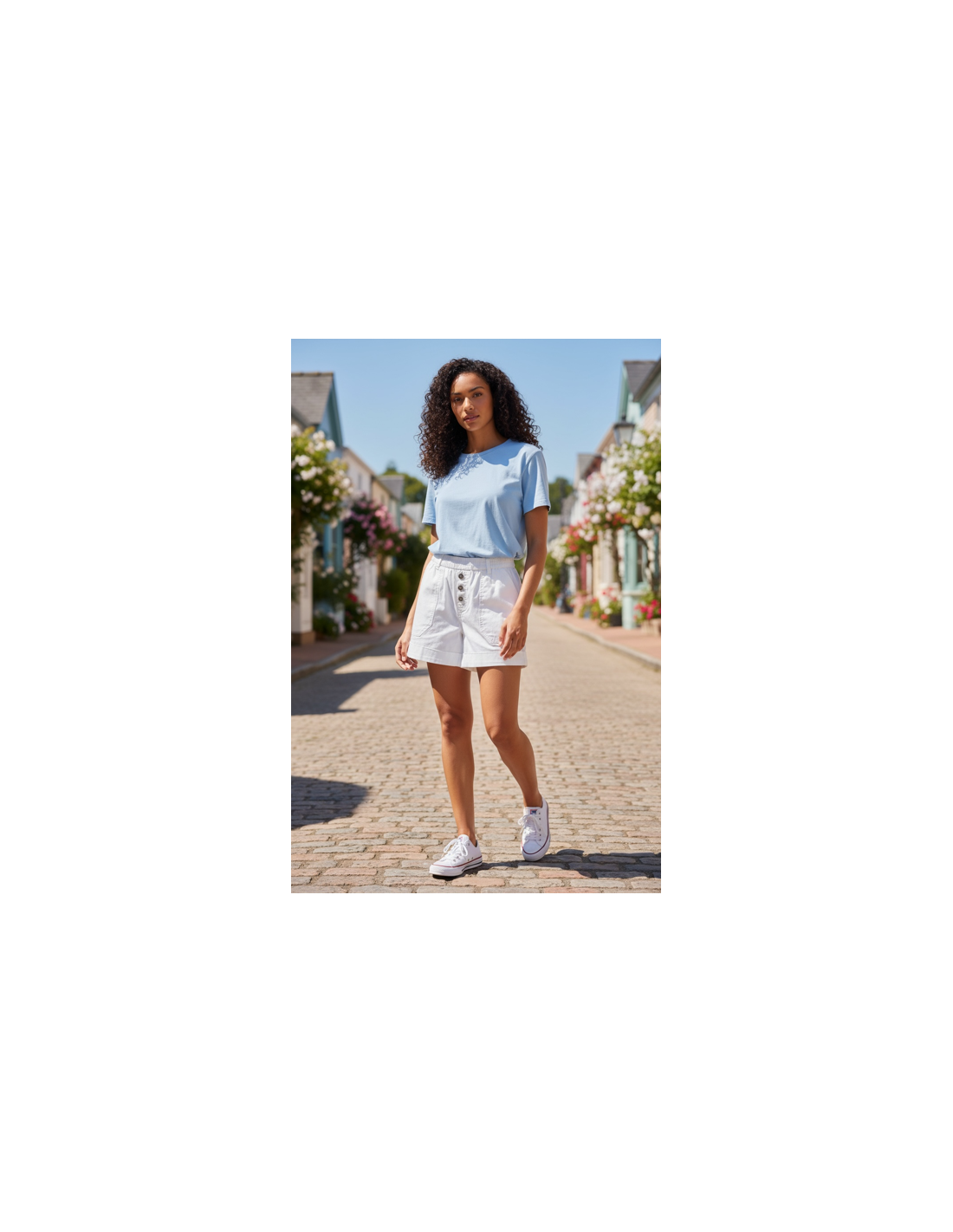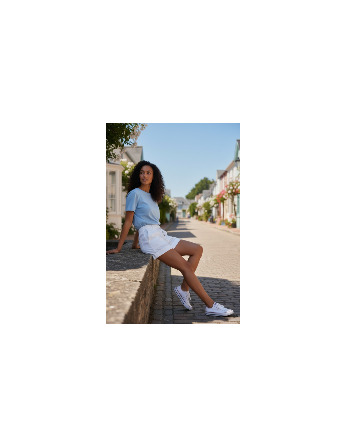 Elastique à la taille avec passants pour ceinture, fermeture boutons pression, 2 grandes poches avant et 2 poches arrière avec un revers en bas
